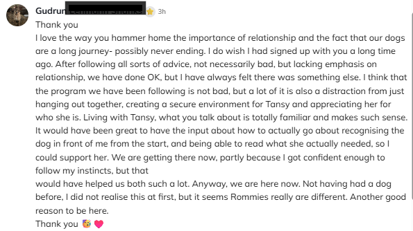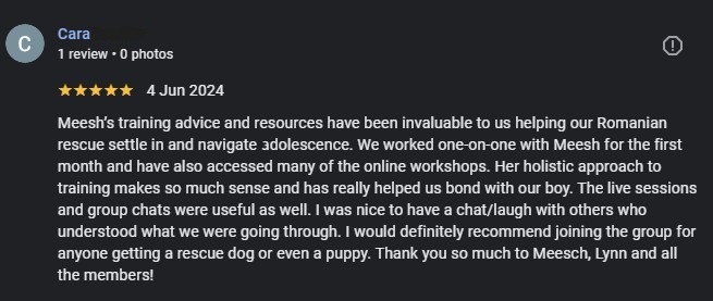 Ongoing 1-1 support from me personally is available through a premium coaching package, which we’ll talk about at the end of your assessment if that feels like the right next step for you and your dog.